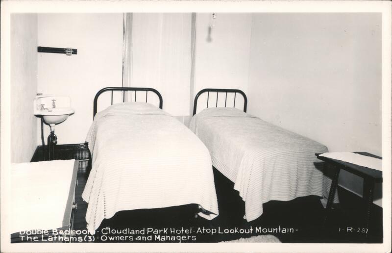 Double bedroom at the Cloudland Park Hotel atop Lookout Mountain. The room has two twin beds with chenille bedspreads, a small sink with hot and cold water, and a small table. The Lathams were the owners and managers.