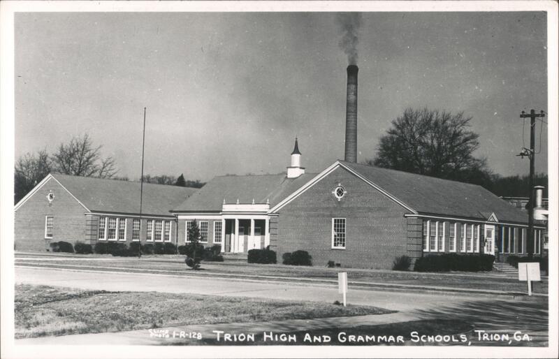 | A vintage, black and white, real photo postcard of the Trion High and Grammar Schools. A smokestack is visible behind the school, with smoke coming out of it. Trees and shrubs are visible in the foreground. A street and sidewalk are visible in front of the school. |