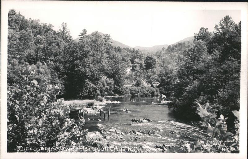 View of the Tuckasegee River with several fishermen standing in the water. Trees and hills are visible in the background, and a small building can be seen on the far bank.