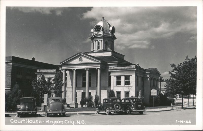 A vintage postcard view of the courthouse in Bryson City, North Carolina. Several cars are parked in front of the building. A sign for Essolub Motor Oil is visible in the background.
