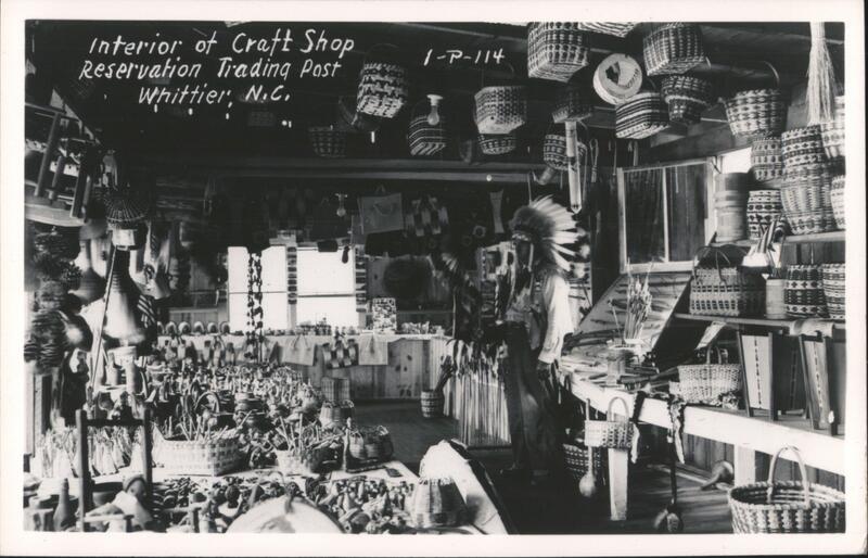 Interior view of a Native American craft shop, likely at a reservation trading post. Baskets, pottery, and other crafts are displayed on shelves and tables. A person in Native American attire is visible.