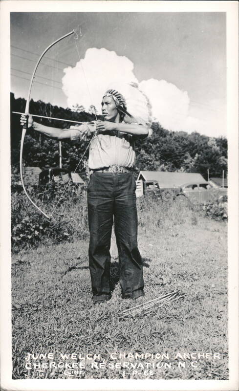 June Welch, wearing a feathered headdress, aims a bow and arrow. He is dressed in a light-colored, long-sleeved shirt and dark pants. Additional arrows lay on the ground at his feet. Trees and buildings are visible in the background.