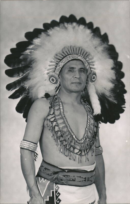A Native American Indian Chief wearing a large feathered headdress and beaded necklace and belt.