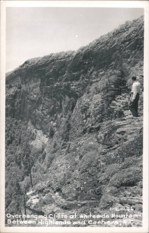 Overhanging Cliffs of Whiteside Mountain between Highlands and Cashiers, NC. A man in light colored pants and shirt stands near the edge and looks out over the cliffs.