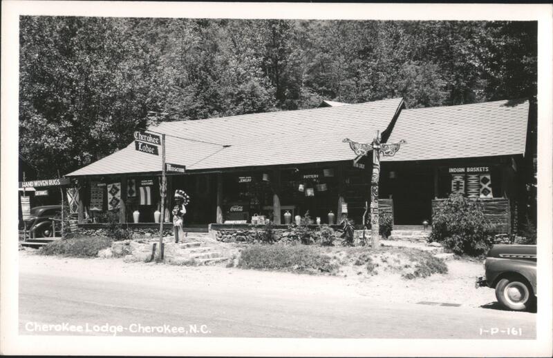 | A view of the Cherokee Lodge Trading Post, with signs advertising hand woven rugs, baskets, souvenirs, jewelry, and pottery. A totem pole stands in front of the building. A person in Native American attire is standing near the entrance. A vintage car is partially visible on the right side of the image. |