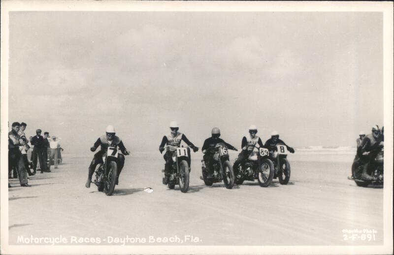 Black and white photo of motorcycle races on the beach. Racers wear white helmets and jerseys with numbers. Spectators line the left side. The ocean is visible in the background.