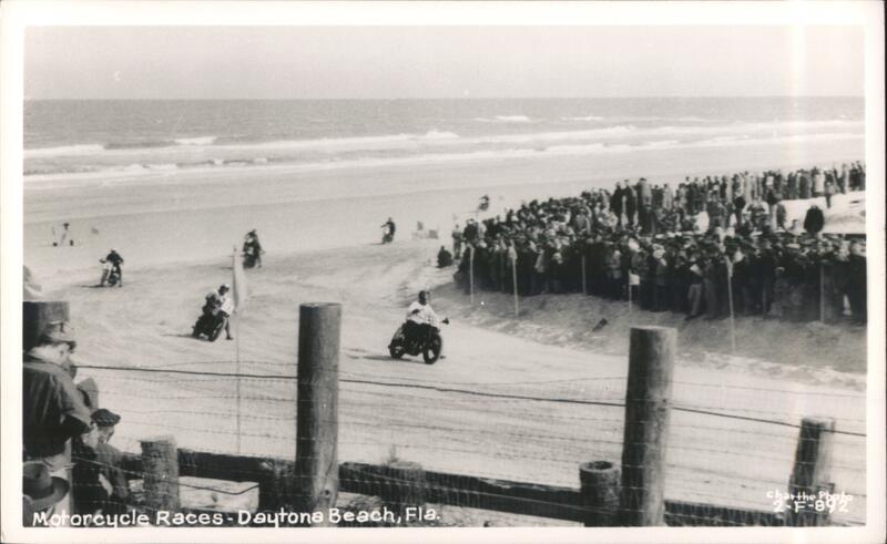 Spectators watch motorcycle races on the beach. A wire fence separates the spectators from the track.