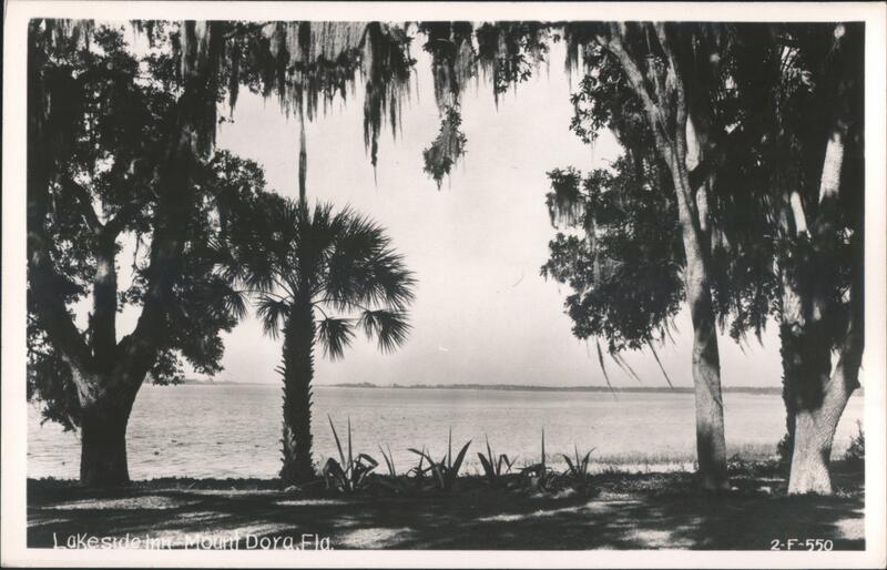 Black and white photo of Lakeside Inn in Mount Dora, Florida. Large oak trees with Spanish moss frame a view of Lake Dora. A cabbage palm and some agave plants are in the foreground.