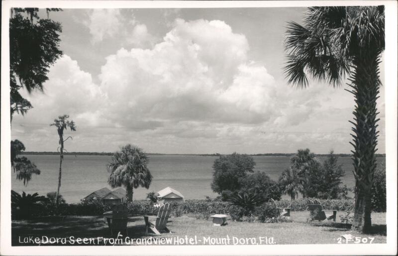 View of Lake Dora with cabanas and lounge chairs in the foreground.