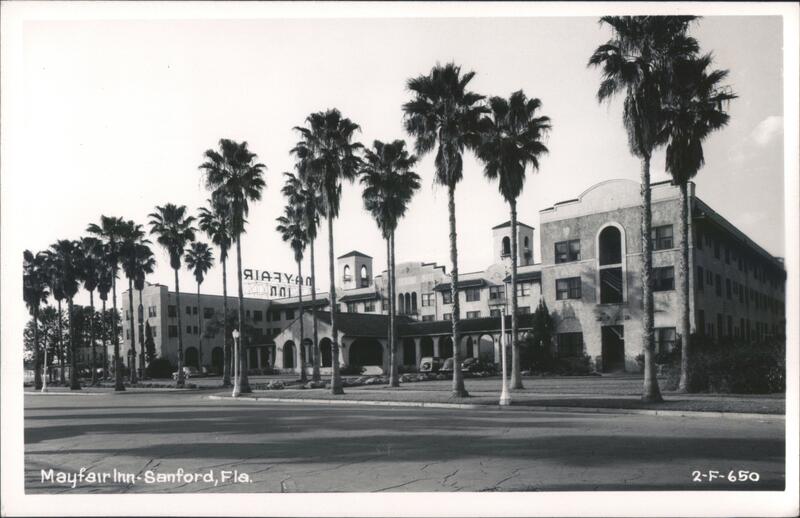 The Mayfair Inn in Sanford, Florida, is pictured with palm trees lining the street in front. Cars are parked under the covered walkway.