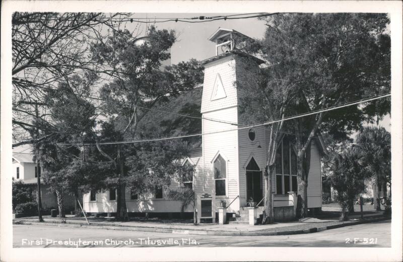 | A view of the First Presbyterian Church in Titusville, Florida. The church is a white, wooden structure with a tall, pointed roof and a small bell tower. The church has large windows and a set of stairs leading to the entrance. There are trees and power lines in front of the church. |