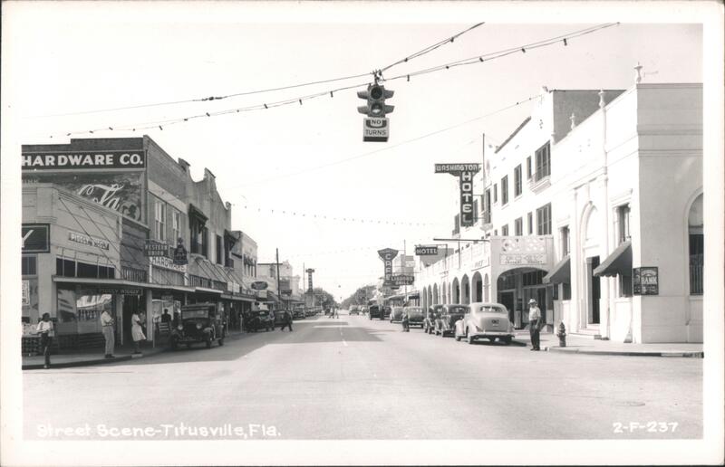 | A vintage postcard view of a street scene in Titusville, Florida. The street is lined with buildings, including the Washington Hotel, Palmetto Cafe, and Citizens Bank. There are cars parked along the street and people walking on the sidewalk. A traffic light with a "No Turns" sign is visible. The street name "Main St" can be seen in the bottom right corner. |
