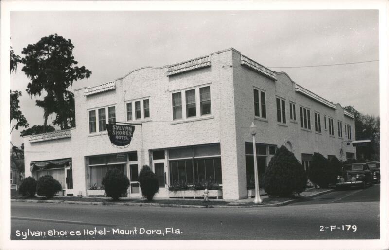 | A vintage photograph of the Sylvan Shores Hotel in Mount Dora, Florida. The hotel is a white, two-story building with a Spanish-style roof. There are two cars parked in front of the hotel, and a few trees and bushes are visible in the landscaping. A sign for the "Cocktail Lounge" is visible on the side of the building. |