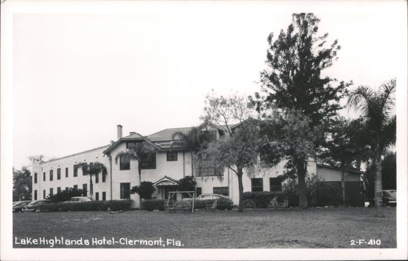 A view of the Lake Highlands Hotel in Clermont, Florida. Several cars are parked in front of the hotel. A swing set and several wicker chairs are visible on the lawn.
