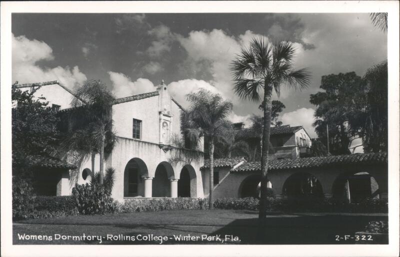 A view of the women's dormitory at Rollins College. Several palm trees are visible in the courtyard.