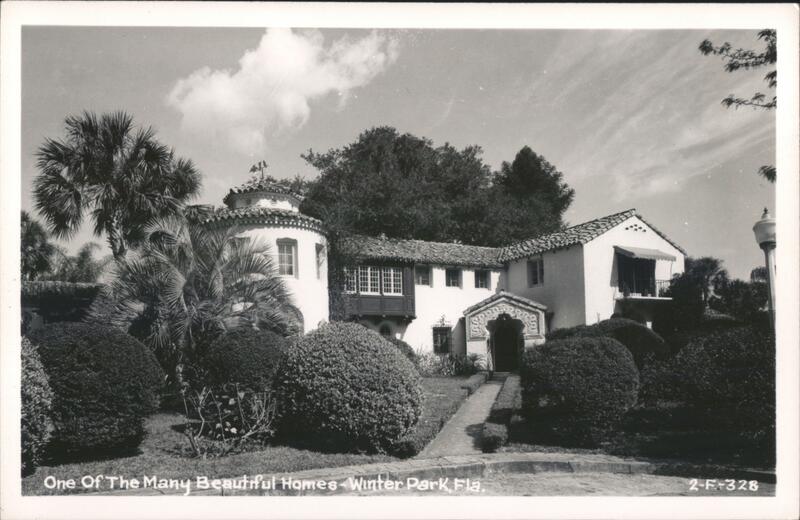 A charming Spanish-style home with a rounded tower, tile roof, and decorative entryway. Lush landscaping and palm trees surround the house. A paved walkway leads to the front entrance.