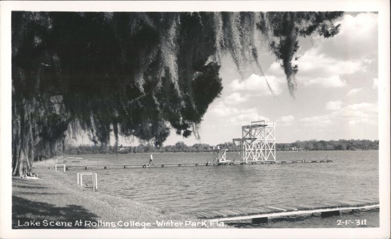 A view of a lake at Rollins College, with a diving platform and a wooden dock. Spanish moss hangs from a tree in the foreground.