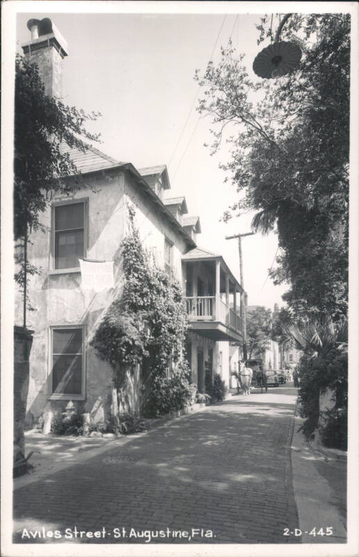 A view of Aviles Street in St. Augustine, Florida. A horse-drawn carriage can be seen in the background. Vines grow on the side of a building.
