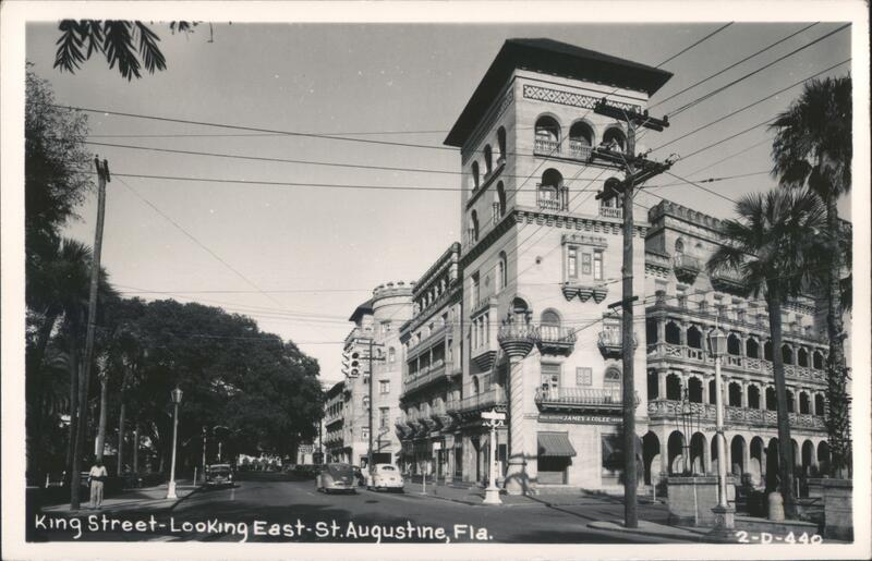 A view of King Street looking east in St. Augustine, Florida. The street is lined with buildings, including a distinctive multi-story building with arched windows and balconies. Cars are parked and driving along the street. A man in light colored clothing stands on the sidewalk near a lamp post. Power lines and palm trees are visible. |