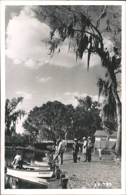 People gather near a small house and several rowboats labeled "Riverest" on the shore of a river. Large trees with Spanish moss line the riverbank. A bridge is visible in the background.