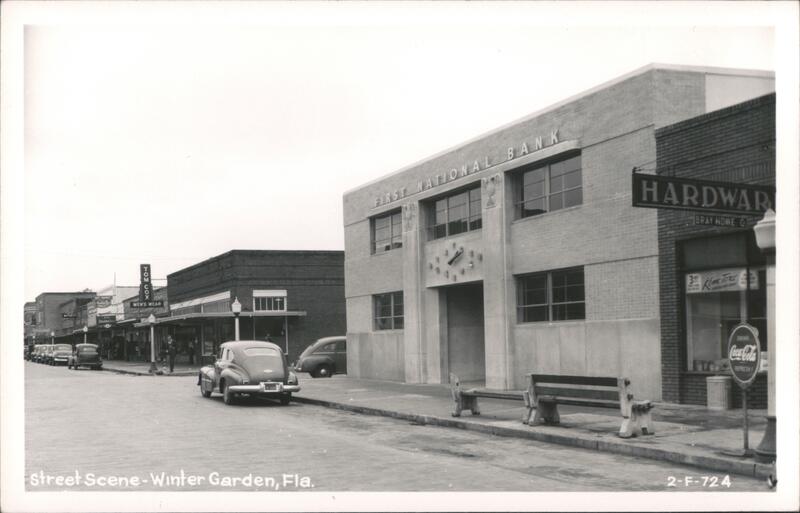 Street scene with cars parked along the road. Businesses include Tom Cox Men's Wear and Bray Howe Hardware. A Coca-Cola sign is visible on the hardware store. A large clock is mounted on the front of the bank.
