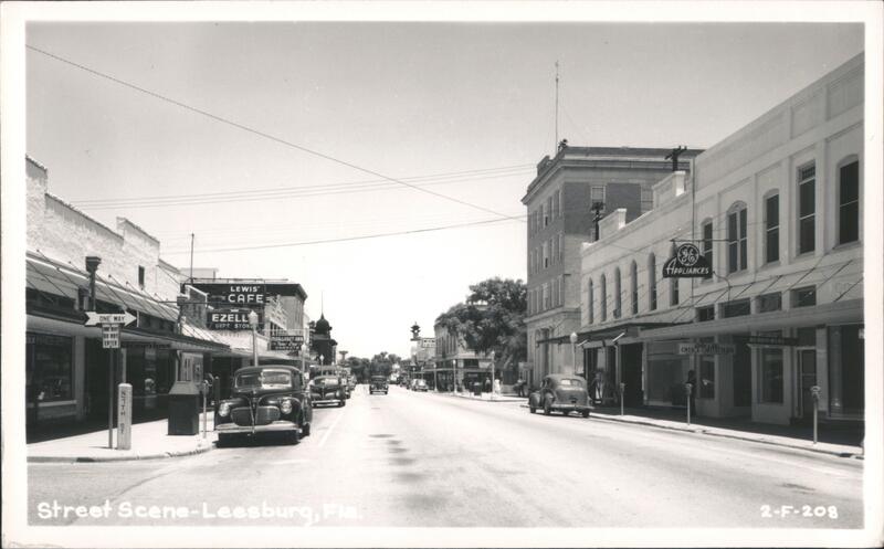 A view of a street in Leesburg, Florida. Cars are parked along the side of the road. Businesses are visible, including Lewis Cafe, Ezell Dept. Store, Margaret Ann New Era Markets, and a GE Appliances store. A one-way sign is visible on the left side of the street. |