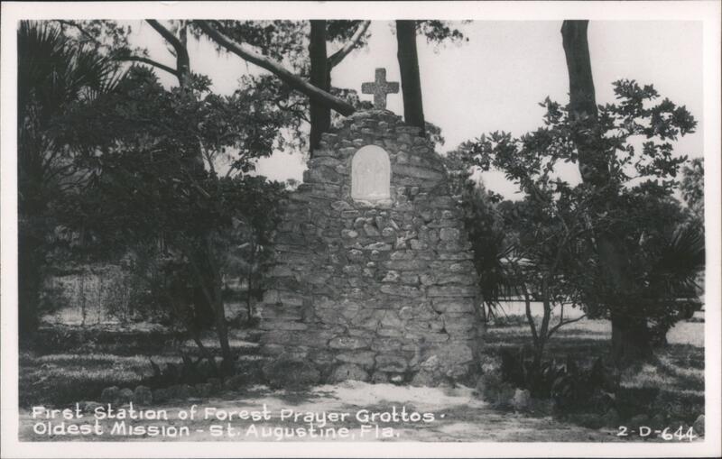 Black and white photo of the first station of the Forest Prayer Grottos at the Oldest Mission in St. Augustine, Florida. A stone grotto with a cross on top is surrounded by trees and other foliage.