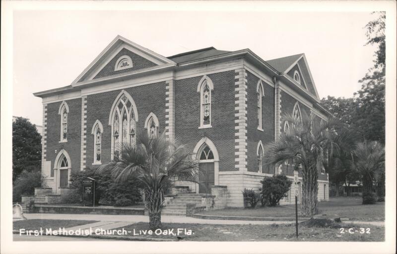 A view of the First Methodist Church in Live Oak, Florida. The church is constructed of brick, with arched windows and a stepped entrance. Palm trees and other landscaping are visible in the foreground.
