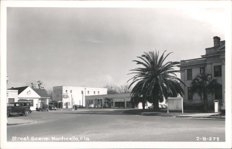 A view of a street in Monticello, Florida. There are cars parked along the street, and buildings lining the sides. A large palm tree is in the center of the image. An Amoco gas station sign is visible.