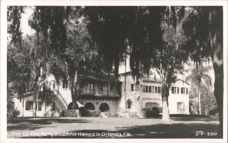 | A large, white stucco house with a tile roof is pictured. The house has several arched doorways and windows, some with shutters. A second-story balcony is visible. Large trees and other foliage surround the house. A manicured lawn is in the foreground. |