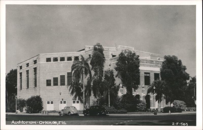 A view of the Orlando Auditorium in Florida. Two cars are parked in front of the building.