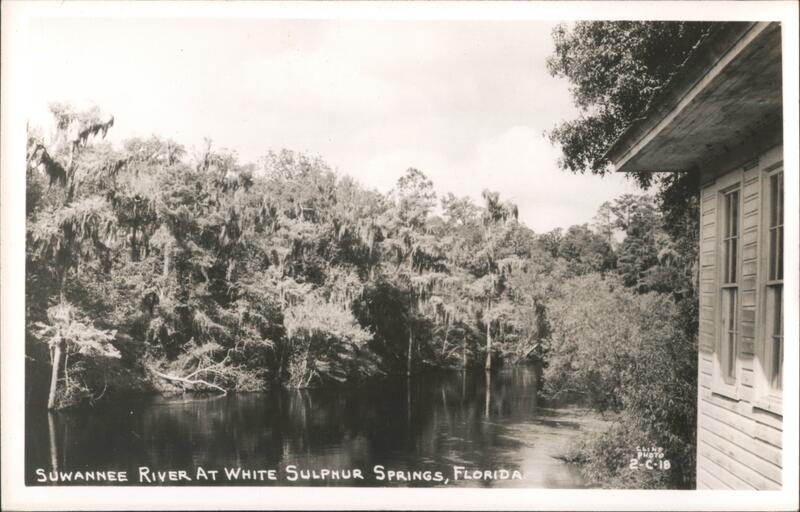 A view of the Suwannee River at White Sulphur Springs, Florida. Lush vegetation and trees draped with Spanish moss line the riverbank. A portion of a building with shutters is visible in the foreground on the right.