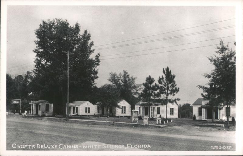 A row of tourist cabins, Croft's Deluxe Cabins, with a sign for cabins and orange juice.