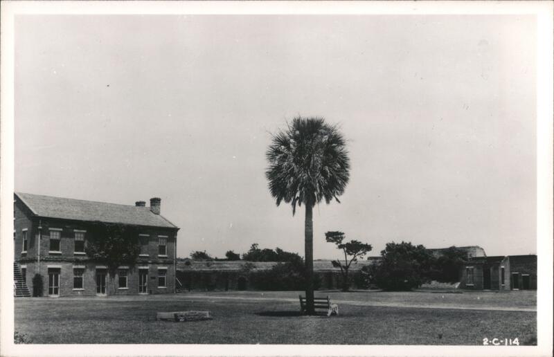 A view of a palm tree and buildings at Fort Pulaski. A bench sits at the base of the palm tree. A stone structure is in the foreground. A brick building with windows is on the left. A brick wall with an archway is in the background.