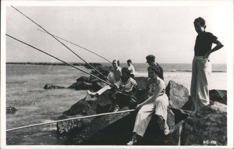 Several people are fishing from jetty rocks. A woman in the foreground sits and holds her fishing pole. Another woman further back rests her foot on a rock. A man stands on the rocks behind the group.