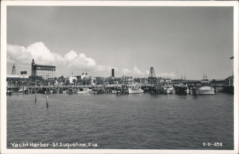View of the St. Augustine Yacht Harbor, showing boats docked at the piers, buildings along the shore, and a bridge in the background.