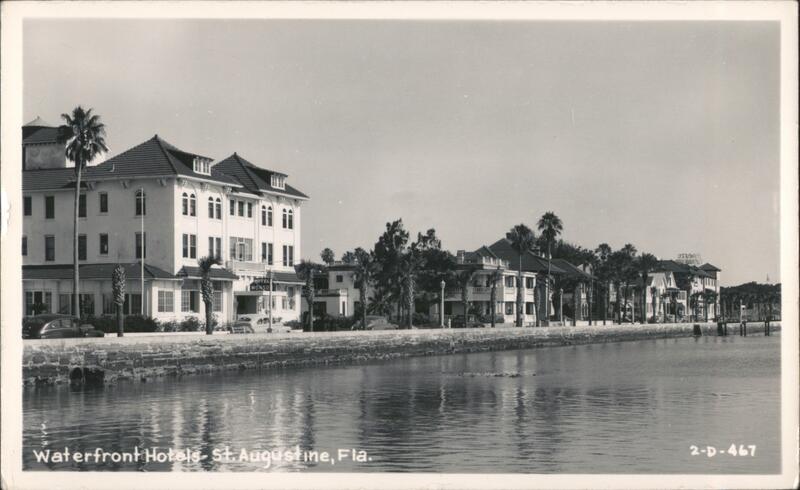 View of waterfront hotels along the Matanzas River in St. Augustine, Florida. The Hotel Monson and several other hotels and residences are visible, with palm trees lining the street. A seawall separates the buildings from the water.