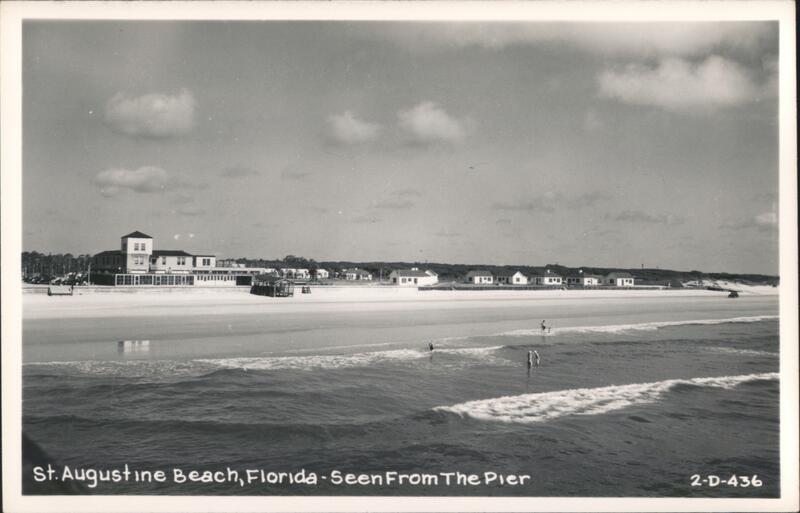A view of St. Augustine Beach, Florida, as seen from the pier. Several people are wading in the ocean. Beach houses and a larger building are visible on the shore.