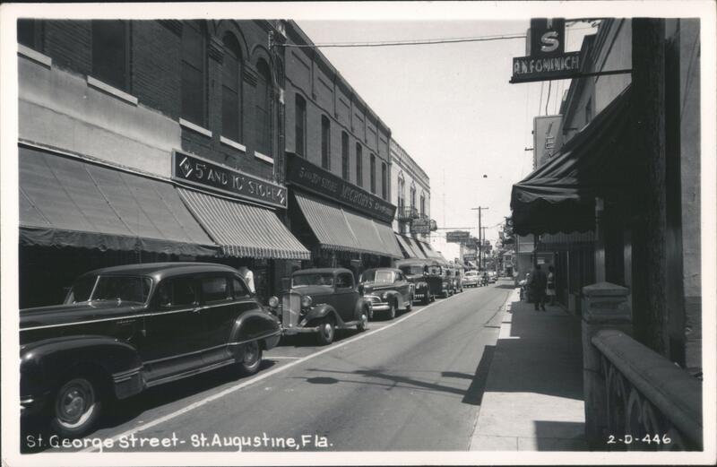 | Vintage street scene of St. George Street in St. Augustine, Florida. Cars are parked along the street in front of various businesses, including a 5 and 10 cent store and McCrory's. Awnings shade the storefronts. A sign for A.N. Fominich is visible. Two women are walking down the sidewalk. |