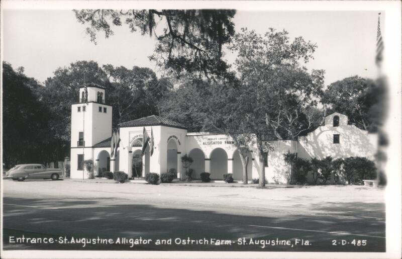 World's Largest Alligator Farm. Entrance shows flags, tower, and arched walkways.