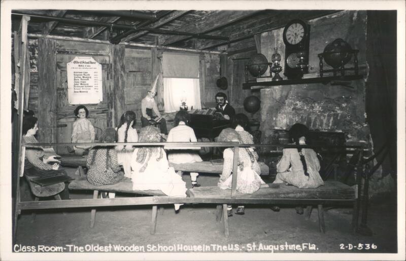 | A view of the classroom in the Oldest Wooden Schoolhouse in the US, located in St. Augustine, Florida. The classroom is furnished with period-style desks, benches, and a teacher's desk. A roll call list from 1864 is displayed on the wall. Dolls are posed as students and teacher. A fireplace, clock, globe, and oil lamp are also visible. |