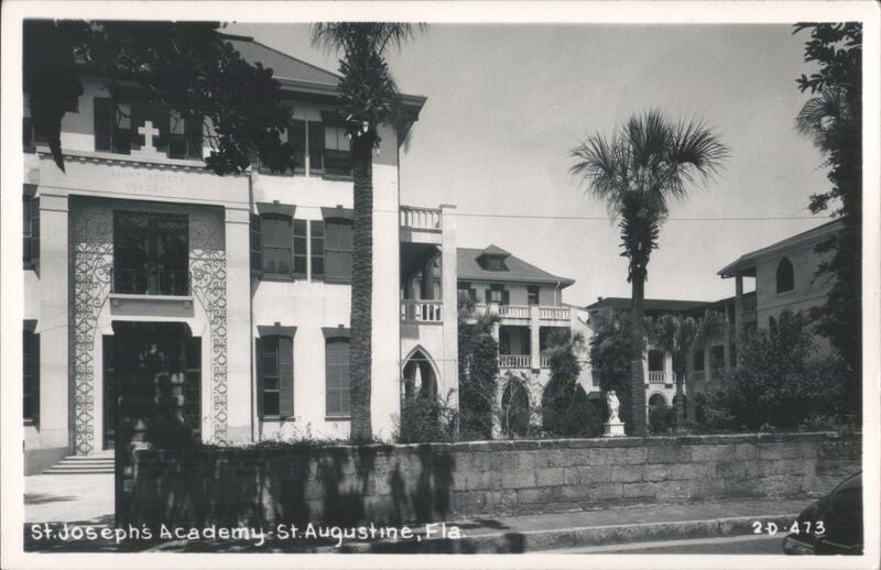 | A view of St. Joseph's Academy in St. Augustine, Florida. The main building is a multi-story structure with decorative elements and shutters. A portion of a second building with a sloped roof and balconies is visible behind the first. A statue stands in a landscaped area enclosed by a low wall. Palm trees and other vegetation are present. A car's rear end is slightly visible in the bottom right corner. |