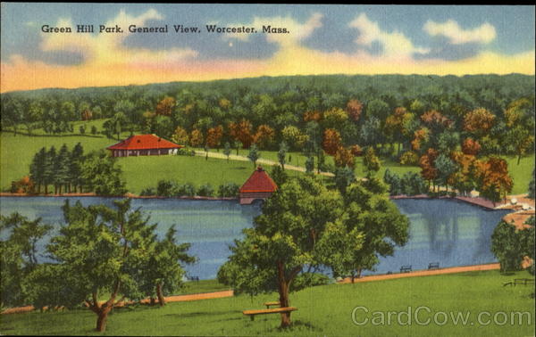 Front: Green Hill Park, General View, Worcester. Mass. Back: 68360 "TICHNOR QUALITY VIEWS" REG. U. S. PAT. OFF. MADE ONLY BY TICHNOR BROS., INC., BOSTON, MASS. PUB. BY PERKINS & BUTLER, INC., WORCESTER, MASS.