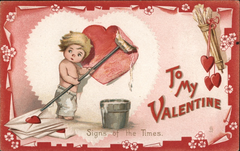 A cherubic, fair-haired toddler, clad in white pants, diligently paints a large red heart with a brush. A bucket of paint sits nearby, alongside a stack of letters adorned with small red hearts. The phrase "To My Valentine" graces the right side of the image, with "Signs of the Times" beneath. The postcard is framed by a decorative red border with floral accents. |