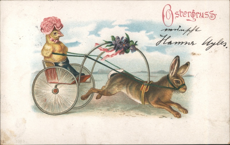 An Easter greeting postcard features a humorous scene of a chick wearing a pink bonnet and driving a rabbit-drawn carriage. The chick sits in a red-cushioned carriage, reins in hand, while the rabbit pulls the carriage along a sandy path. Purple flowers adorn the carriage, adding a touch of springtime festivity. |