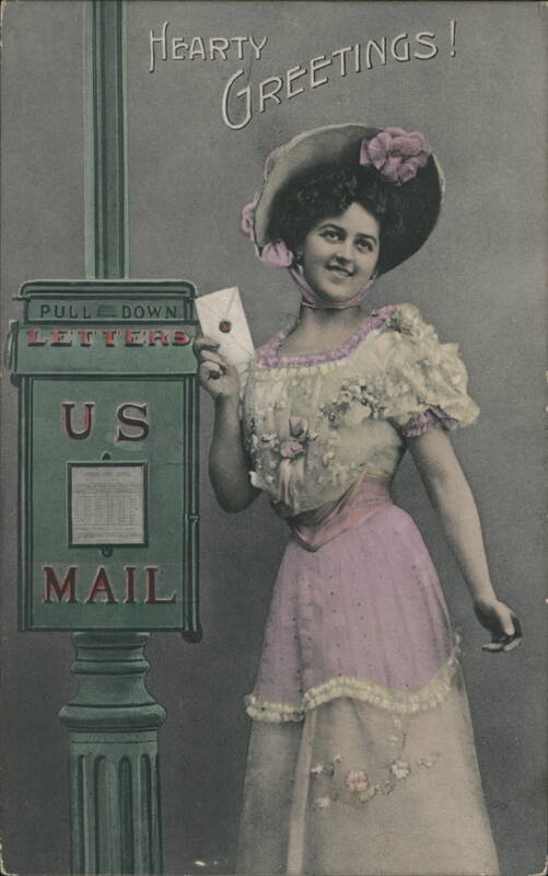 Front: HEARTY GREETINGS! PULL DOWN LETTERS Used MAIL R Back: 650 UTLAN 11-30A 19 07 VT. to A Happy New year all your July *** DEC TM 1706 FRANKL POSTA UNIT TATES OF Mrs. Les J. Di 38 Cresent of Rutharid Printed in Germany