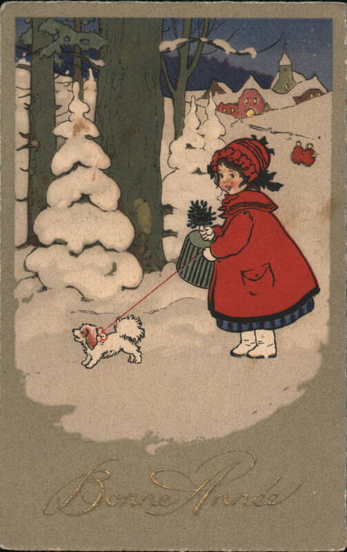 A charming vintage postcard captures a little girl in a red coat, walking her small white dog through a snowy village. The girl carries a small, decorated pail. Snow-covered trees and houses create a festive winter scene. Two smaller figures can be seen sledding in the background. The French phrase "Bonne Année" (Happy New Year) is written at the bottom of the image. The back of the postcard has a handwritten message in French extending New Year's greetings.