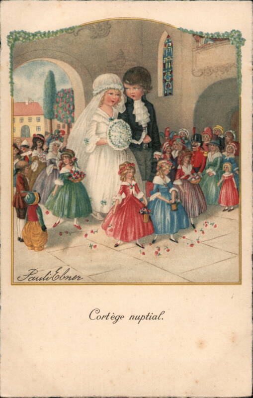 A charming vintage illustration depicts a child wedding scene. The young bride and groom, dressed in formal attire, stand at the entrance of a church, surrounded by children acting as wedding guests. The bride holds a bouquet, and flower girls scatter petals. The scene is lighthearted and fanciful, with a touch of old-world charm.