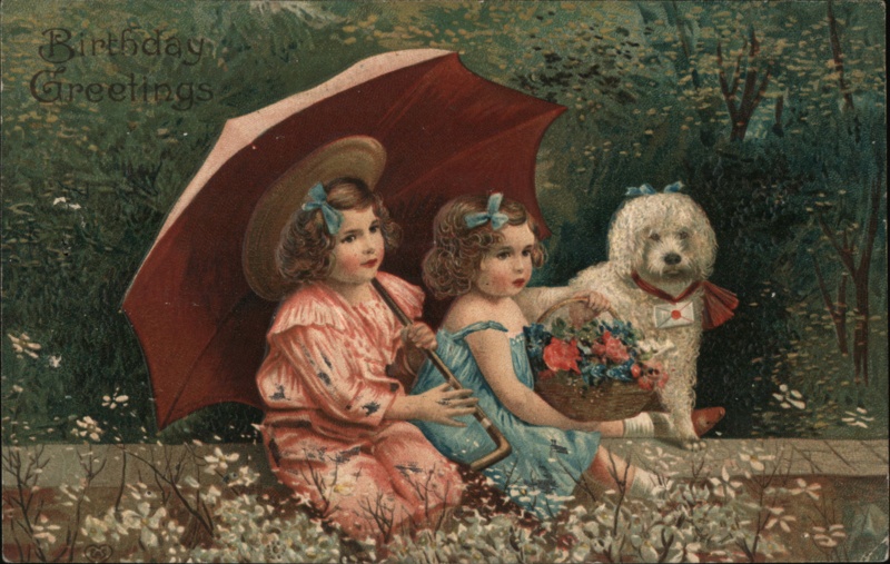 | Vintage postcard featuring two young girls, possibly twins, sitting on a low wall adorned with white flowers. One girl holds a red parasol, while the other clutches a basket of colorful flowers. A small white dog, possibly a Bichon Frise, sits next to them. The dog wears a red collar or bow. The background is a lush green foliage, evoking a garden or park setting. The words "Birthday Greetings" are inscribed at the top left corner. |