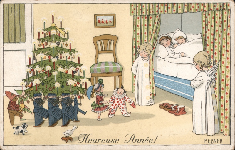 Antique German Christmas postcard features two children sleeping in a canopied bed while a guardian angel watches over them. A Christmas tree stands nearby, adorned with ornaments and candles. Toy soldiers march in formation, a doll dances, and a small dog and duck observe the scene. The text "Heureuse Année!" (Happy New Year!) extends holiday wishes. |